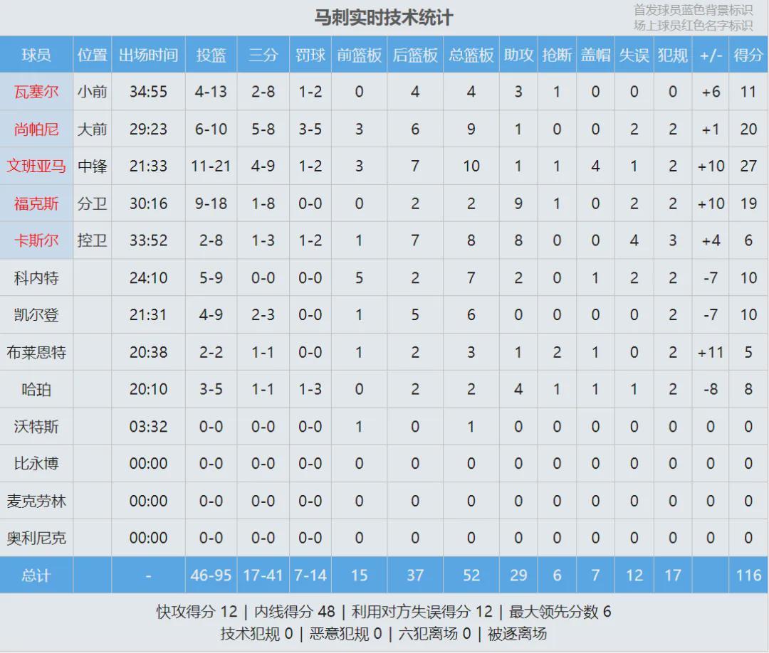 马刺两个首发后卫,上半场如同梦游:卡斯尔5中1,福克斯6中1。这哥俩上半场合计11中2,仅得5分3失误。还得靠文班,第二节他依然只打了5分钟。上半场出战10分钟,13中5拿到14分6篮板1助攻1抢断1盖帽,正负值-2。